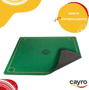 El Tapete de Neopreno para Cartas 80x80 cm de Cayro es el complemento ideal para los amantes de los juegos de mesa. Su diseño en color verde con detalles en dorado ofrece una estética clásica y elegante, perfecta para disfrutar de partidas de póker, bridge, mus, blackjack y otros juegos de cartas.