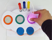 Los niños quedan absolutamente fascinados viendo cómo la luz cambia de color según la tinta que eligen. Rojo, azul, amarillo... cada color tiene su propia luz, creando una conexión sensorial que potencia el aprendizaje de los colores y estimula la coordinación ojo-mano.