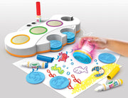 Lo que hace realmente especial a este set es su sistema de iluminación integrado. Cada vez que tu peque presiona un sello contra la almohadilla de tinta, la perilla superior se ilumina con el color correspondiente. Es un feedback visual inmediato que refuerza la experiencia creativa y añade un toque de magia al proceso.