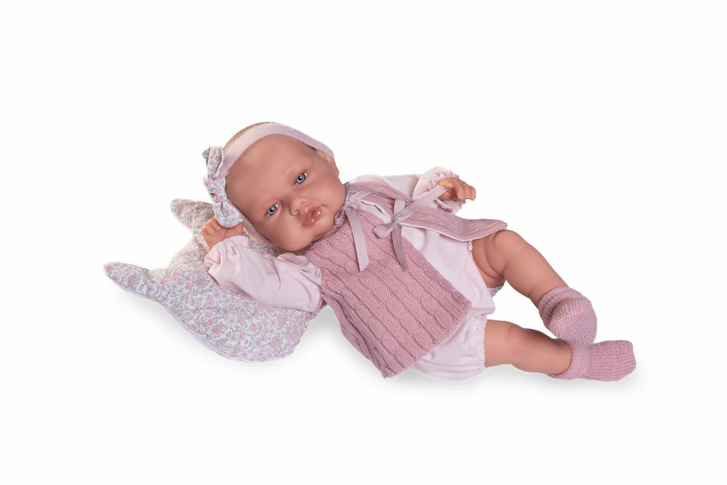 Esta muñeca forma parte de la línea Classics de Muñecas Antonio Juan y está pensada para niños a partir de 3 años. Gracias a su cuerpo articulado, puede adoptar diferentes posturas, lo que hace el juego mucho más realista. Además, incluye un cojín estampado para que los momentos de descanso también formen parte del juego 🧸💤.