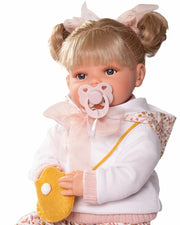 Sus coletas con lazo resaltan su carita dulce, y su mecanismo de sonido hace que llore al quitarle el chupete. Pero con solo ponérselo de nuevo… ¡volverá la calma! Y gracias a su cuerpo blandito y extremidades de vinilo, es ideal para abrazarla durante todo el día.